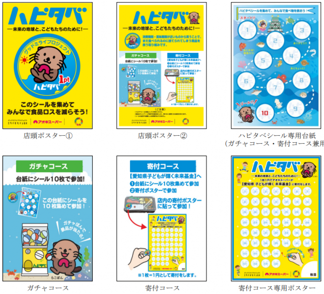 「ハピタベ」とは、「ハピネス(幸せ)」と「食べる」の造語で、消費期限・賞味期限が近い食品に 「ハピタベシール」を貼り、顧客に優先的に購入してもらうことにより、食品ロスの削減を目指すを取り組み。シールを集めた顧客は「ガチャコース」「寄付 コース」のどちらかを選んで参加できる。