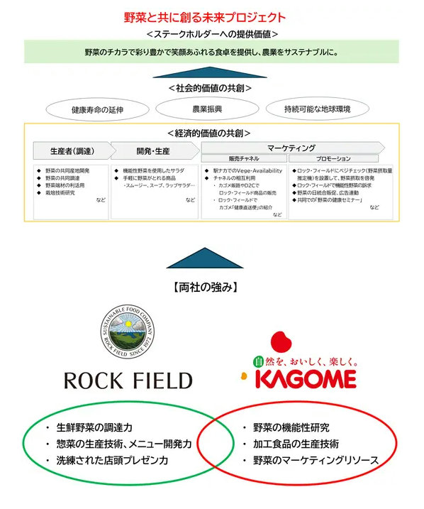 ロック・フィールドとカゴメは、生活者の健康寿命の延伸に貢献するため、2017年から「Social Good Collaboration」の理念を共有し、野菜の彩りやおいしさ、栄養価を最大限に活かした惣菜レシピや商品の共同開発で協業してきた。