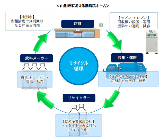 (株)セブン‐イレブン・ジャパン(東京都千代田区、永松文彦社長)は3月27日(木)から、山形市内のセブン‐イレブン39店舗に「ペットボトル回収機」を設置し、ペットボトルリサイクル事業を開始する。山形県のセブン‐イレブン店舗に設置するのは初めての取り組みとなる。
