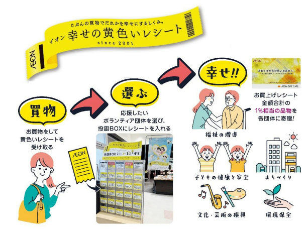 顧客は、精算時に受け取った黄色いレシートを、地域のボランティア団体名が書かれた店内備え付けの投函箱に投函する。イオンはレシート合計金額の1%分の品物をボランティア団体に寄贈する仕組みになっている。投函箱には各団体の活動内容が記載されており、顧客自身が応援したい団体を選択することができる。