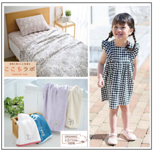 寝具・インテリア商品は、オーガニックコットンを100%使用している。エコテックス(OEKO-TEX Standard100)の認証により、安全性試験に合格していることが証明されている。バスタオル979円、2枚組フェイスタオル759円、タオルケット2420円、敷きパッド2420円。