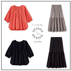 サステナブルコットンは、生産時、農薬や水の使用が少なく、環境負荷を減らしながら栽培された綿花を使用している。レディース ブラウス2189円、レディース スカート2420円。