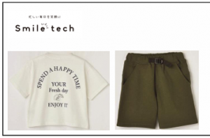 環境に優しいオーガニックコットンを20%使用している。生地には摩擦に強い特殊加工を施していて、乾燥機にかけても縮みにくく、毛玉になりにくい。ベビー・キッズ Tシャツ1089円、ベビー・キッズ ボトムス1309円。