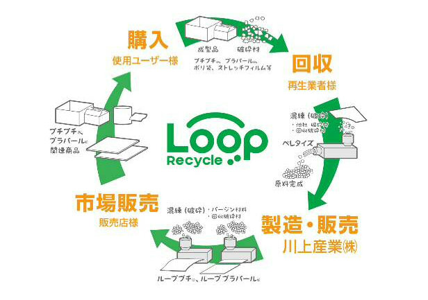 回収したプチプチは、原料となるペレットに加工され、製造される再生原料として新たな「プチプチ®」に生まれ変わる。また、川上産業では「ループリサイクル」と名付け、工場から出る端材などの回収も実施。使用済み製品を利用した新たな製品を購入する、循環型のリサイクルが可能となっている。