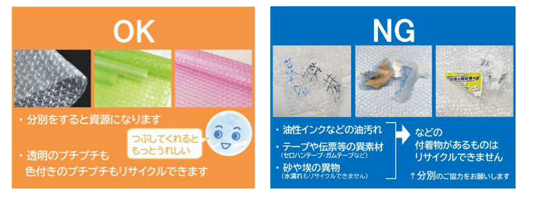 プチプチの分別については、プチプチとは異なる素材(セロハンテープやガムテープ、郵送伝票など)が付いていると、リサイクルする際に悪い影響が出る可能性があるため、何も付いていない状態で分別を行う必要がある。