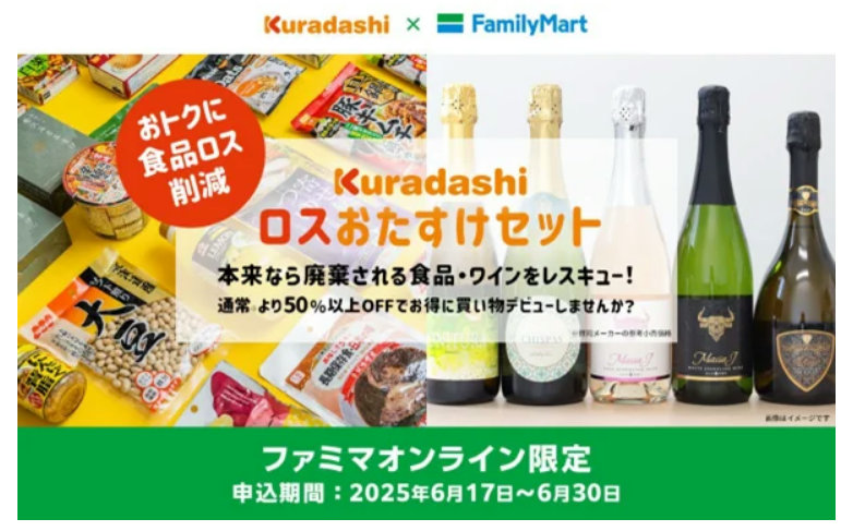 (株)ファミリーマート(東京都港区、細見研介社長)は、食品ロスになる可能性のある食品20点以上を詰め合わせた商品セット「ロスおたすけセット」とワインをセットにした商品を、6月17日(火)からECサイト「ファミマオンライン」で400セットの数量限定で販売を開始する。