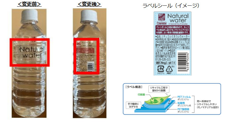 リニューアルでは、ラベルの文字サイズの変更やデザインを見直すことで、プラスチック使用量の削減を実現。また、ボトルと同一系素材の環境配慮型のラベルを採用しているので、印字面はリサイクル工場での洗浄工程でインクが除去され無色透明となるので、ラベルをはがし忘れたペットボトルがリサイクル工場へ回収された場合でもリサイクルが可能となる。