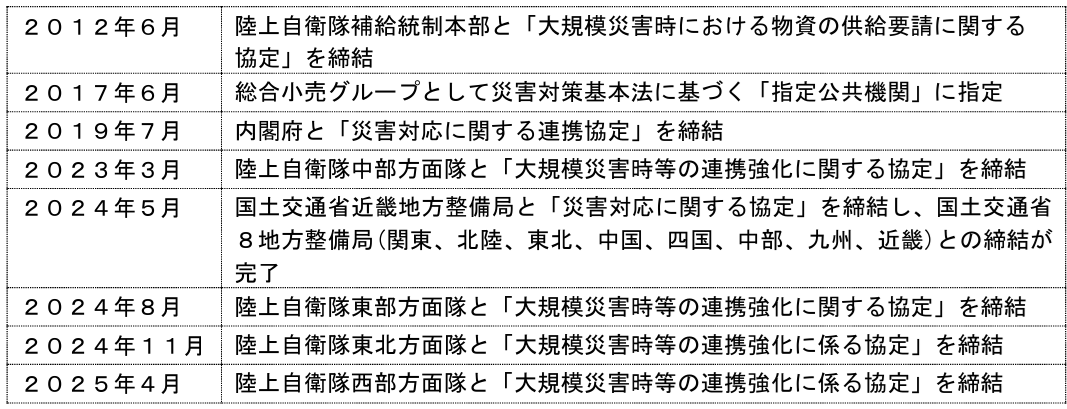 イオンは、災害時に迅速かつ適切な対応を行うため、陸上自衛隊を含むさまざまな団体と協定を締結している。そのなかで、陸上自衛隊各方面隊との協定締結は、2023年に中部方面隊と結んだ協定を起点として全国をカバーする体制づくりを進めてきた。2024年には東部方面隊および東北方面隊と、2025年4月には西部方面隊と協定を締結。北部方面隊とも協定を結ぶことで全方面隊との連携を完了したことになる。