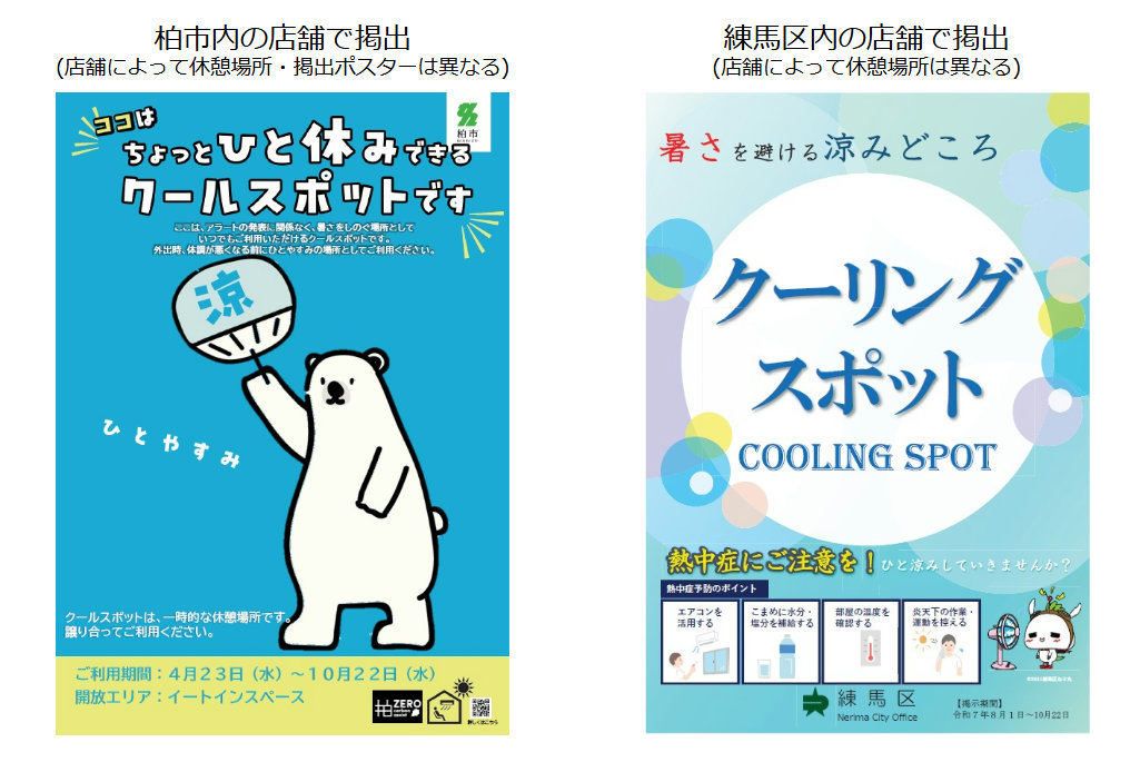 柏市では「クールスポット」として7月25日(金)~10月22日(水)の間、練馬区では「クーリングスポット」として8月1日(金)~10月22日(水)の間、一時的に涼を取れる場所として開放する。