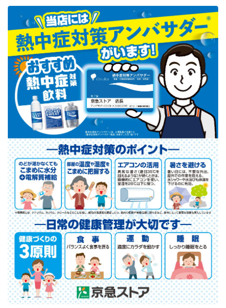 熱中症対策売り場を展開し、熱中症に関する啓発ポスターを掲出するほか、ウェブサイト・アプリでの情報発信も行っている。