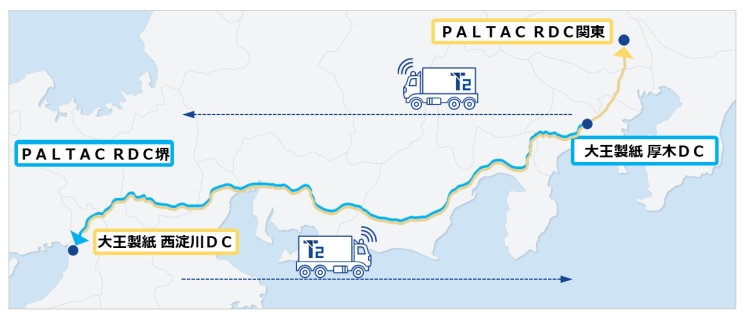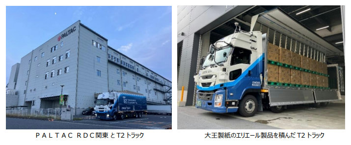 レベル4自動運転トラックによる幹線輸送の開始に先立ち、自動運転トラックで持続可能な物流が実現できるかを確かめるべく、T2が開発したレベル2自動運転トラック(ドライバーの監視のもとに行われる、特定条件下での高機能自動運転)で、関東・関西に所在する大王製紙の物流センター(DC)とPALTACの大型物流センター(RDC)の間で貨物を輸送し、オペレーションの有効性を検証する。