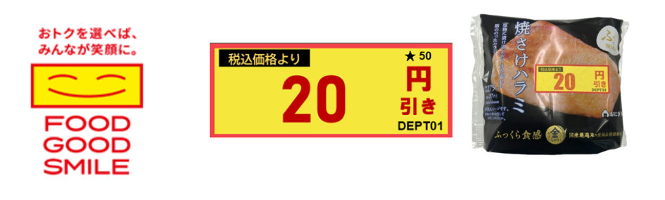 「FOOD GOOD SMILE」では、消費期限が近付いた商品を購入することで、お客は購入しやすい価格で商品を入手でき、食品ロス削減につながる。また値引きシールが貼付されたおにぎりの購入で寄付につながる「おトクを選べば、みんなが笑顔に。」なるプログラムとなる。