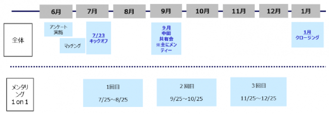 メンター(部長クラス以上の女性)、メンティー(課長クラスの女性)各社2名で8社計32名が参加する。イオンは2024年から参加した。約7カ月間のメンタリングプログラムを実施する。期間中は1on1を原則対面にて3回行い、中間共有会では、メンティー同士での学びの共有やロールモデル講演を予定している。