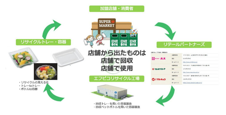 「エコストア共同宣言」とは、リテールパートナーズ各店舗の店頭で回収された使用済み食品トレーを新たな食品トレーに生まれ変わらせる「トレーtoトレー」及び使用済みペットボトルを回収して新たな透明容器に生まれ変わらせる「ボトルto透明容器」の水平リサイクルを推進するもの。