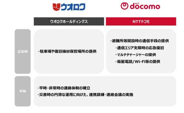 災害時の具体的な連携として、ウオロクが所有・管理する店舗敷地をドコモの災害復旧活動拠点として提供し、ドコモは被災地域における通信サービスの早期復旧に取組む。ドコモは、ウオロクの店舗敷地内に避難所が開設された場合に、ドコモの「災害対応充電器(マルチチャージャ)」や衛星電話などを配備し、被災者や帰宅困難者の通信手段確保のための支援を行う。