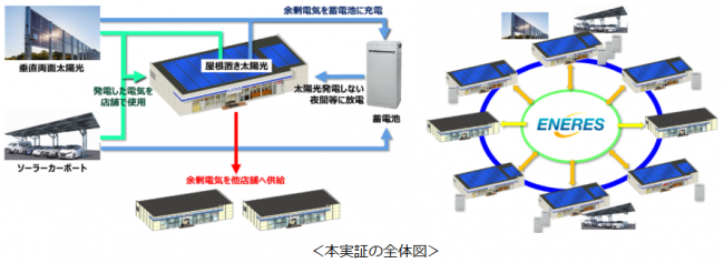群馬県内のローソン26店舗に蓄電池設備を設置し、そのうちの2店舗にソーラーカーポートや垂直両面太陽光などの太陽光発電設備を設置。ここに、太陽光発電設備や蓄電池設備を設置することができない6店舗を加え、合計32店舗の電力を最適に統合制御する検証を行う。