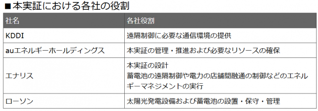 KDDI(株)、auエネルギーホールディングス(株)、(株)エナリスと行う。ローソン店舗のCO2排出量削減および電力の需給バランスの安定化に向けたもので、国内コンビニエンスストア業界として初の取り組み。