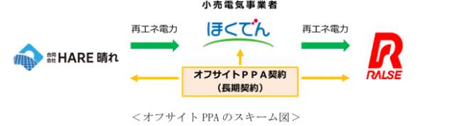 ラルズが所有・運営する施設における脱炭素化の実現に向け、アークスグループは、オフサイトPPAの仕組みを活用し、HARE晴れが所有・運営する太陽光発電所5カ所(恵庭市および千歳市)で発電する電力を、北海道電力を通じてラルズが所有・運営する施設で使用する。