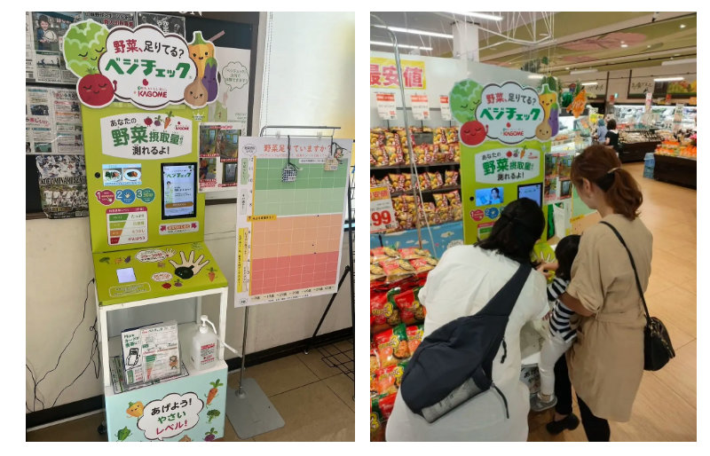 「野菜摂取頻度向上の取り組み」では、買い物かごの底に「野菜足りていますか?」の啓蒙メッセージの入ったポスターの貼付や、カゴメがドイツのBiozoom社と共同開発した、推定野菜摂取量を測定できる「ベジチェック」を増坪店内に設置する。