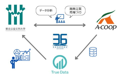 東北公益文科大学の教育プログラムは3回目となる。「Aコープ やわた店」は購買データの提供や売場を提供する。学生が実購買データと消費者ビッグデータ、AIを活用して年末商戦における鍋つゆ売場を考案・展開する。TrueDataはデータ分析環境の整備、統計化した全国購買データ・市場データ分析ツールの提供、データマーケティング支援を行う。