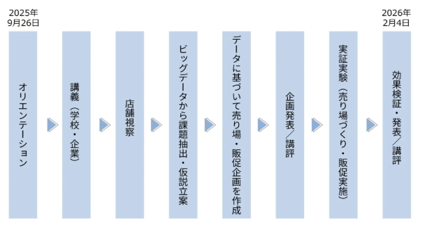 学生はデータ分析から施策立案・実行、効果検証までを一貫して行う実践的な教育プログラムを通して、実社会で通用するデータ分析スキルと課題解決能力を養う。Aコープ やわた店は、学生とともにデータマーケティングによる売場づくりを実践・検証することで、より地域から愛される店づくりを目指す。