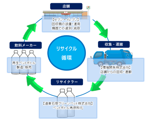 “サーキュラーエコノミー”として、回収したペットボトルはリサイクルされ、再びペットボトル飲料として販売される。
