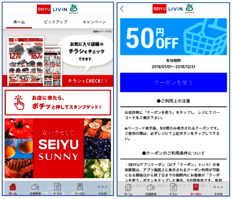 機能/登録店舗のデジタルチラシ配信、来店チェックインスタンプ付与(100スタンプ貯まると50円クーポンと交換)、店舗やエリアごとのクーポン配信、「プライスロック」対象商品の紹介バナー配信、料理レシピ動画「デリッシュキッチン」のレシピ動画へのリンク、SNS公式アカウント(LINE・Twitter)や、ネットスーパー「SEIYUドットコム」、お客さまアンケート「ユアレポ」へのアクセス