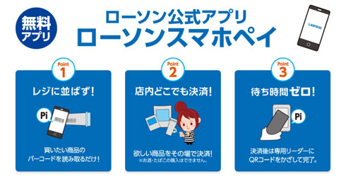 「ローソンスマホペイ」にはローソンの公式アプリを使用する。顧客はあらかじめこのアプリをダウンロード(無料)しておく。店頭では、購入する商品のバーコードをスマホのカメラで読み取り、アプリ上で決済する。決済後に表示される QRコードを店頭の読み取り機にかざせばいい。アプリに電子レシートを表示することも可能だ。
