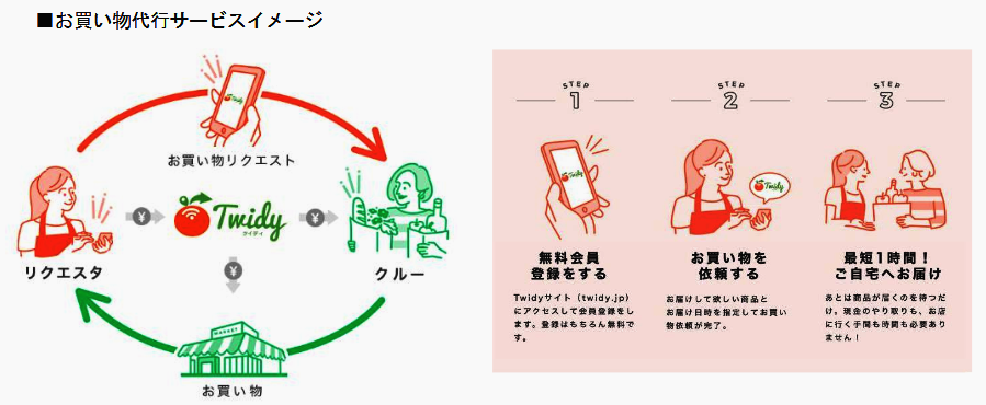 お客はスマホを使って、Twidyに登録されているスーパーマーケットを選び、希望の日時と買って届けてほしい商品をサイト上でオーダーし、決済する。あらかじめTwidyクルーとして登録していた地域住民が、お客に代わって買物をし、その商品を指定先まで届ける。最短で1時間で配達する。商品代金とは別に、代行費用が発生する。クルーは代行の報酬を得ることができる。買物に行けない子育て中の共働き世帯には便利だし、クルーは自分の空いている時間を使って副収入を得ることができる。