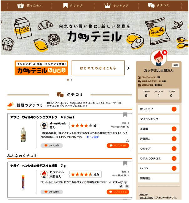 新たなサービスは、「カッテミル」のトップページに、話題のクチコミや投稿されたクチコミをタイムラインで表示する。クチコミされている商品が一目で分かるUI(ユーザーインターフェイス)へと刷新される。