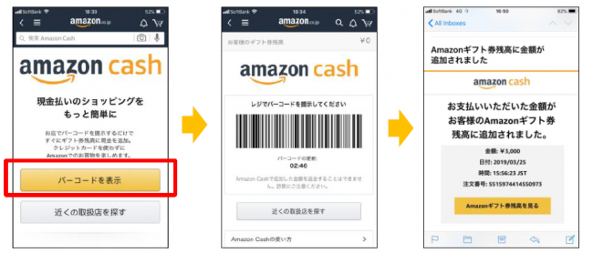 チャージは、スマートフォンに表示されるAmazon Cashのバーコードを、コンビニエンスストアやドラッグストアなど全国1万5000以上の対象店舗の店頭レジに提示し、現金を支払って行う。この支払い金額がAmazonギフト券の残高としてAmazonアカウントに自動的に追加される。1回当たり500円から4万9000円までチャージでき、1円単位で利用することができる。