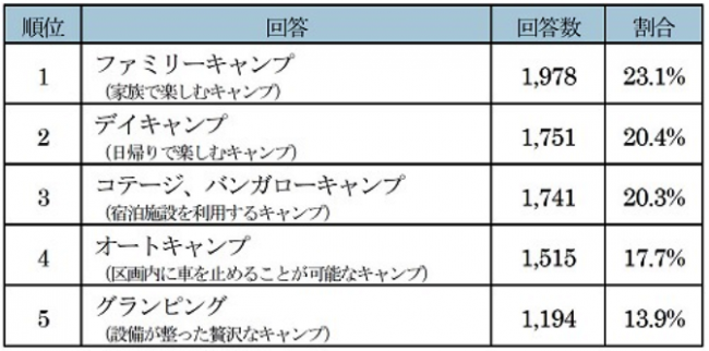 キャンプをする場合、したいキャンプは「ファミリーキャンプ(家族で楽しむキャンプ)」が1位。家族で楽しむのがキャンプの王道のようだ。2位は簡便な「デイキャンプ(日帰りで楽しむキャンプ)」、3位は本格的な宿泊を伴う「コテージ、バンガローキャンプ(宿泊施設を利用するキャンプ)」だ。