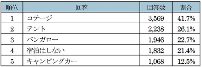 4位の「宿泊はしない」人も21.4%いる。設問1の2位デイキャンプ20.4%との相関関係が見える。ほかにも車や車中泊との回答もあった。