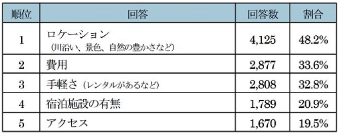 「ロケーション(川沿い、景色、自然の豊かさなど)」が1位。次いで、「費用」が2位で、「手軽さ(レンタルがあるなど)」が3位。1位の「ロケーション」が48.2%と高く、多くの人がキャンプをする場合は景色がいいところや、自然の豊かさを味わえることを重視していることがわかる。ほかにもファミリーキャンプ候補地として、「安全性」や「子どもが危なくないところ」など子どもの安全を重視している意見も多かった。