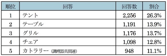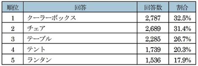 「クーラーボックス」、「チェア」、「テーブル」の順だ。テントやランタンも必需品のようだ。ほかには「ハンモック」や「トイレテント」などの回答もあった。