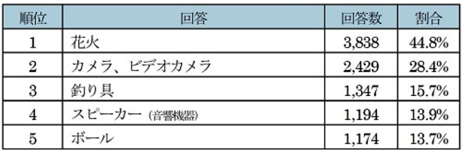 花火が44.8%で1位、「カメラ、ビデオカメラ」が2位、「釣り具」が3位。4位には、スピーカーがランクインしていて、キャンプをする場合、音楽も欠かせないことがわかる。その他には、キャンプで映画を見る人のための「シアターキャンプ」に必要な、モバイルプロジェクターの回答もあった。