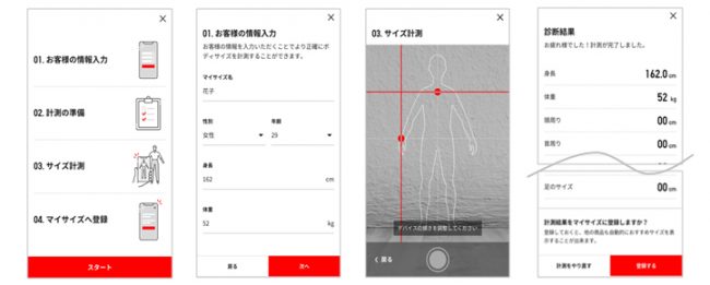 数値は、オンラインストア上で体の寸法を記録しておける「マイサイズ」機能に登録ができる。