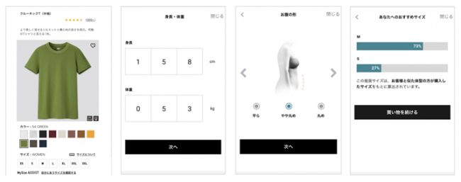 「MySize ASSIST」は、身長や体重のデータに加えて、体型の特徴や「ぴったり」「ゆったり」といった自分好みの着用感を入力すると、似た体型の他のお客がどのようなサイズを購入したかというデータを反映させて、おすすめのサイズを表示する。一度利用すると、別の商品を閲覧した場合でもおすすめのサイズが自動的に表示されるようになる。