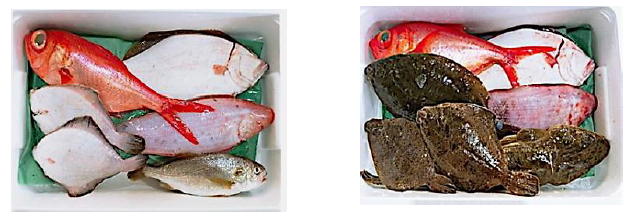 鮮魚詰め合わせボックスの「小」は2500円(本体価格、以下同じ)、「大」は4000円。魚種は金目鯛、活〆ひらめ、赤舌ひらめ、メイタガレイ、金目鯛、活〆ひらめ、赤舌ひらめ、メイタガレイ、活〆マコガレイ、活〆コチなど。