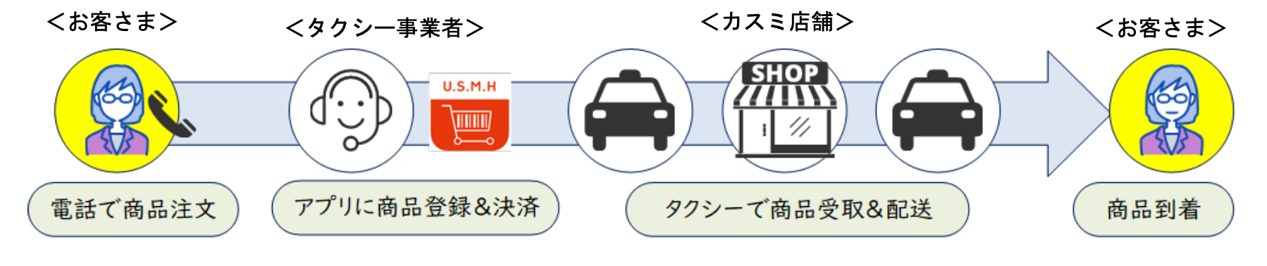 地域の利用者はタクシー事業者に電話で商品を頼み、タクシー事業者はアプリで商品の注文および決済を代行して、カスミの店舗から商品を受け取ってお客の自宅まで届けるという流れになる。