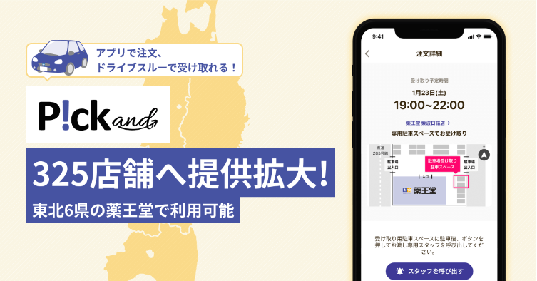「P!ck and」は(株)10Xのプラットフォーム「 Stailer」を利用したアプリ。薬王堂の商品をスマートフォンのアプリから注文し、店頭または店舗駐車場で車上受け取り(ドライブスルー受け取り)ができるというもの。