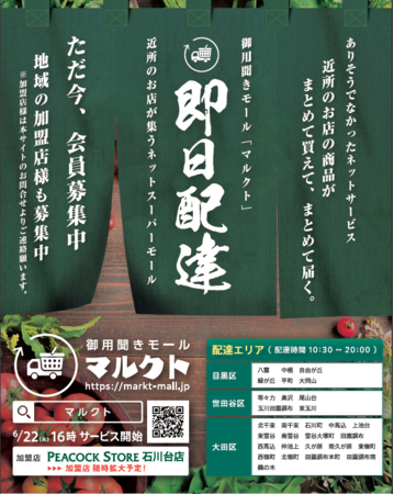 同サービスは、(株)ルーフィ(東京都中央区、渡辺泰章社長)が運営するネットスーパーモール「御用聞きモール『マルクト』」の加盟店第1号店として出店して行うもの。「マルクト」は、配送エリア内の小売店が複数出店するため、さまざまな店舗の商品をまとめて注文、決済、配送することが可能なネットスーパーサービスだ。ピーコックストア石川台店は大田区(一部地域を除く)、目黒区・世田谷区(各一部地域のみ)を対象に、配送サービスを行う。