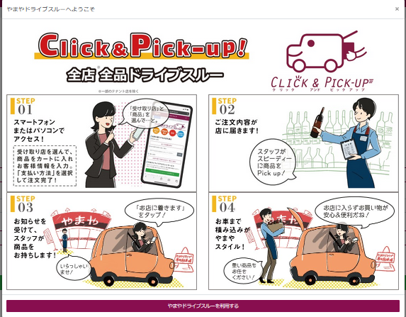 「やまやドライブスルー」はスマートフォンなどで買物を済ませた後、指定した「時間」「店舗」で商品を受け取れるサービス。店舗スタッフが車に商品の積み込みを行う。スマホ決済やクレジットでの事前清算なら、非接触での買物ができる。