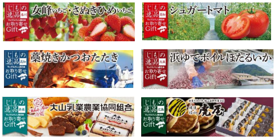 現在取り扱っている商品の一例として、香川の「女峰いちご・さぬきひめいちご」、高知の「シュガートマト」、高知の「藁焼きかつおたたき」、兵庫の「浜ゆでボイルほたるいか」、鳥取の大山乳業農業協同組合の「ギフトミルク」、広島の虎屋の元祖名物「虎焼 」などがある。