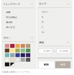 1つ目は、商品の検索機能。トレンドワード、カラー、サイズ、価格から検索できるようになり、たとえば「冷感」「母の日」「ゆったり」などのトレンドワードと、サイズ・カラーを組み合わせて絞り込むことで、素早く自分好みの服が検索できる。