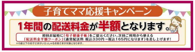 また子育て中の人に気軽に利用してもらうため、初回の商品配送の際に「母子健康手帳」を提示すれば1年間利用できる「配送料半額クーポン」を発行する。