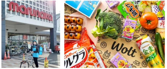 マルナカ若草店では、生鮮食品や日配品、アルコール飲料、そして日用品など約1200品目を取り揃え、注文から30分程度でWoltの配達パートナーが自宅など希望の場所に商品を届ける。配達可能な料金は1回の買物につき1500円以上(税込)。注文はWoltの公式ウェブサイトまたは専用アプリを利用する。