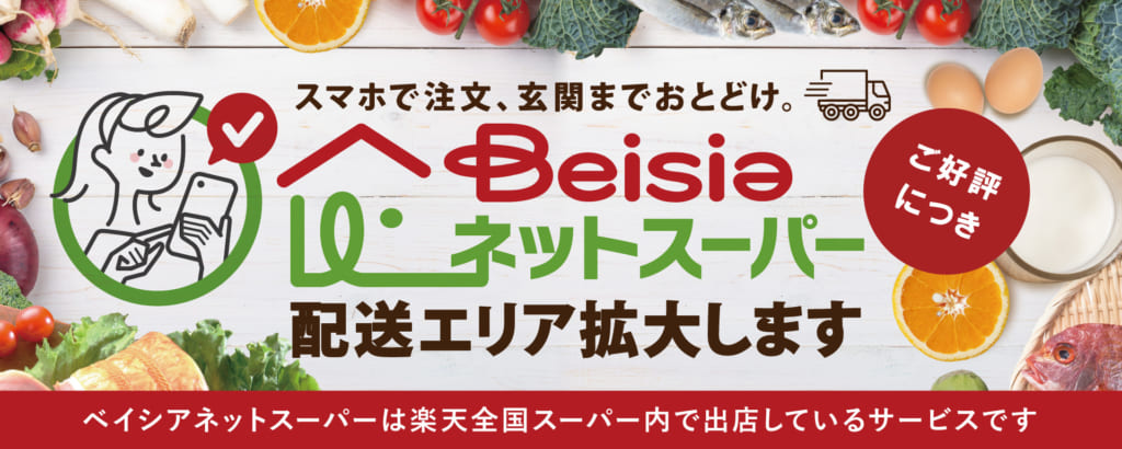 (株)ベイシア(群馬県前橋市、橋本浩英社長)は、楽天グループが提供するネットスーパーのプラットフォーム「楽天全国スーパー」内に開設している「ベイシアネットスーパー」の対象店舗として、群馬県で新たに4店舗を追加する。