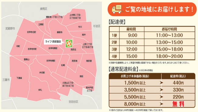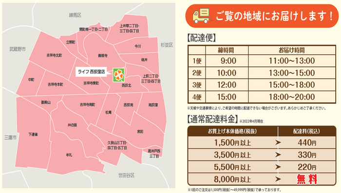 ライフネットスーパーの取り扱い商品はいずれの店舗も食料品、惣菜、日用品など。注文金額は1500~4万9999円(税抜き)で、決済方法は代引きまたはクレジット払いとなる。配送時間は1日4時間帯。配送料として、注文金額が税抜き8000円以上の場合は無料、5500円以上の場合は220円(税込み、以下同)、3500円以上の場合は330円、1500円以上の場合は440円がかかる。