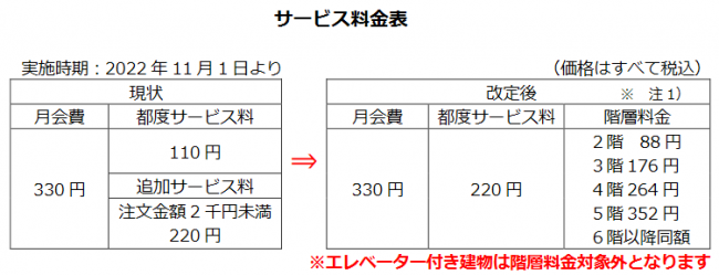月会費は330円で変わらないが、都度サービス料110円を一律220円に変える。これまでの注文金額2000円未満の追加サービス料220 円を廃止する。